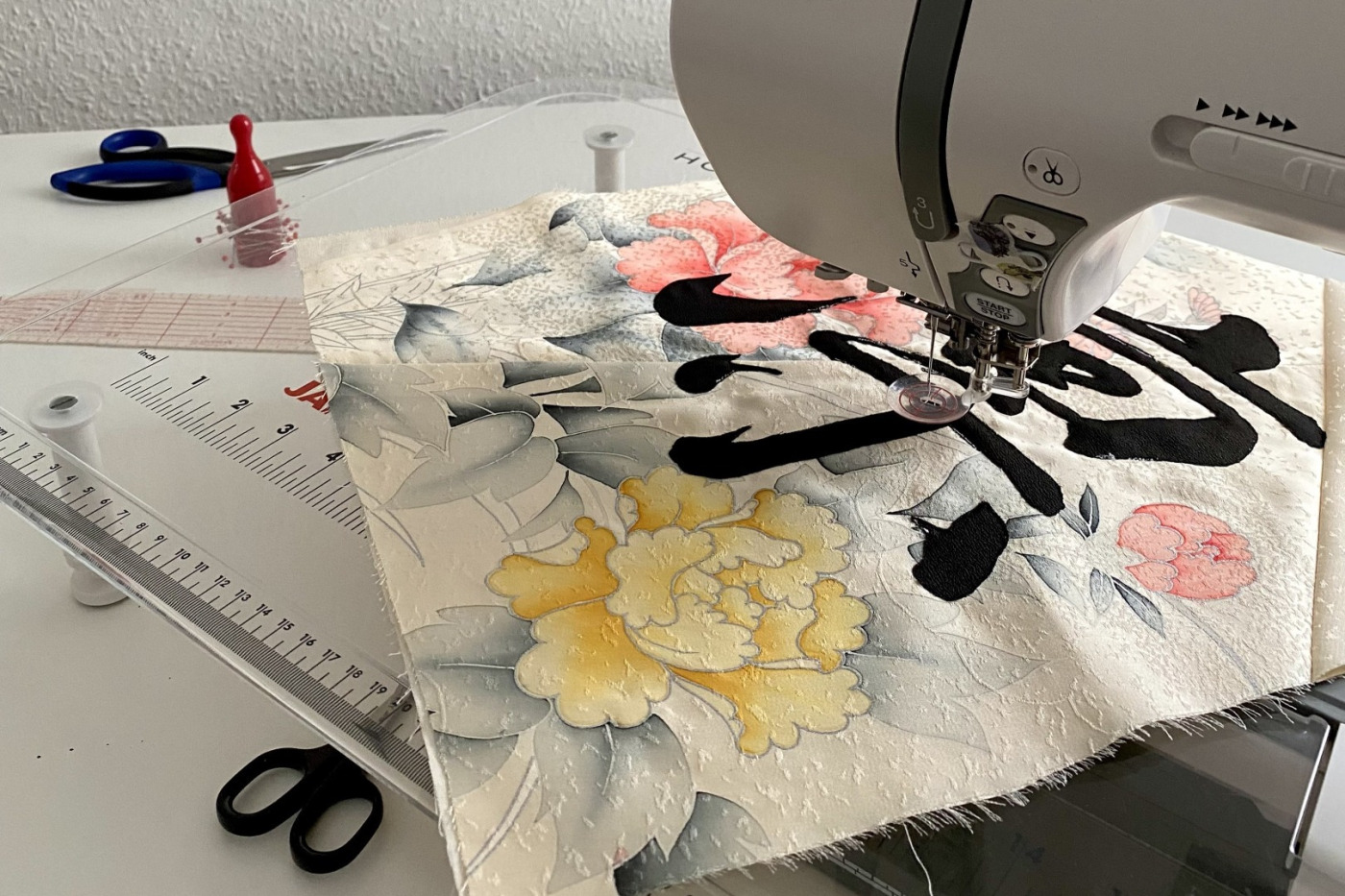 Dann setze ich mit Respekt die Schere in den Kimonostoff. Ich lasse mich von der Inspiration leiten. Nun beginnt das Puzzeln. Zwischendurch prüfe ich immer wieder die Positionierung der Kalligraphie. Das Bild entsteht durch das Überlagern der Muster der Kimonostoffe mit der Kalligraphie, und so ist die gegenseitige Wertschätzung bedeutsam. Bei jedem Vernähen eines Stoffstückes lege ich die Kalligraphie auf, um das Zusammenspiel zu sehen. Ich betrachte das Werk aus der Entfernung. Wenn ich das Gefühl habe, dass es nicht stimmt, trenne ich die Naht wieder auf. Und nähe erneut. Dieser Prozess wiederholt sich. Vielleicht gleicht es etwas dem Malen eines Gemäldes.