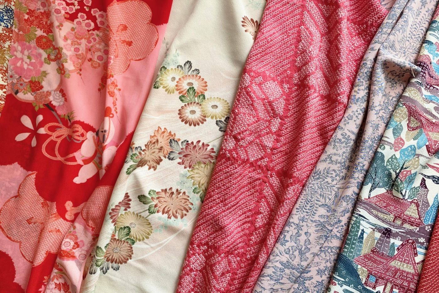 Die meisten der Kimonos, die mich erreichen, sind solche, die vor der Verbreitung des Tintenstrahldrucks hergestellt wurden. Es gab eine Zeit, als die japanische Wirtschaft kontinuierlich wuchs, und viele erwachsene Frauen als Zeichen ihres guten Geschmacks kostspielige Kimonos besaßen. Kimonos aus dieser florierenden Zeit zeichnen sich durch gewagtes und verspieltes Design aus, und haben eine Vielfalt an Farben und Muster, wie man sie heute nicht mehr findet. Nachdem diese Kimono ihre Rolle als Kleidung beendet haben, finden sie nun zu mir. Aus welcher Zeit die Kimonos auch stammen mögen, es ist sicher, dass ihre Handwerker, Produzenten und Besitzer*innen stolz auf diese traditionell japanische Tracht waren und diese mit Sorfalt pflegten.